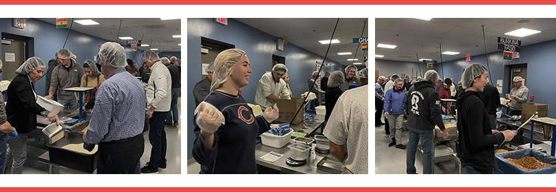 Weather around the holidays is unpredictable, so we got a little nervous when the forecast called for the first snow of the season on November 21 — the date of our group volunteering activity. The snow came — but it didn’t stop our members from turning hunger into hope at the Feed My Starving Children meal packing event in Aurora.